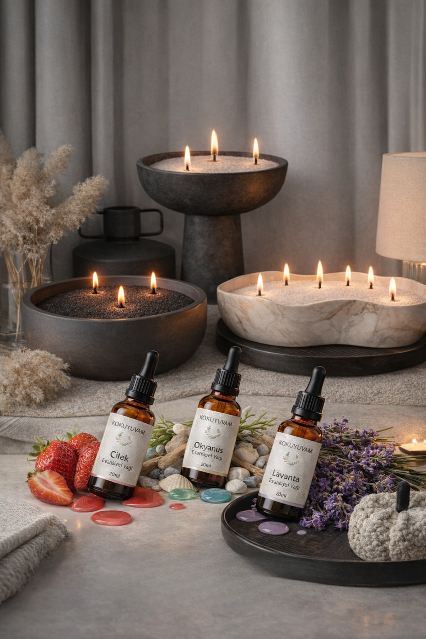 Her yakışınıza keyif katacak en sevilen aksesuarları keşfedin. Ahşap fitillerden şık aparatlara kadar tüm parçalar, Kokuyuvam inci mumunuzla mükemmel uyum için tasarlandı.