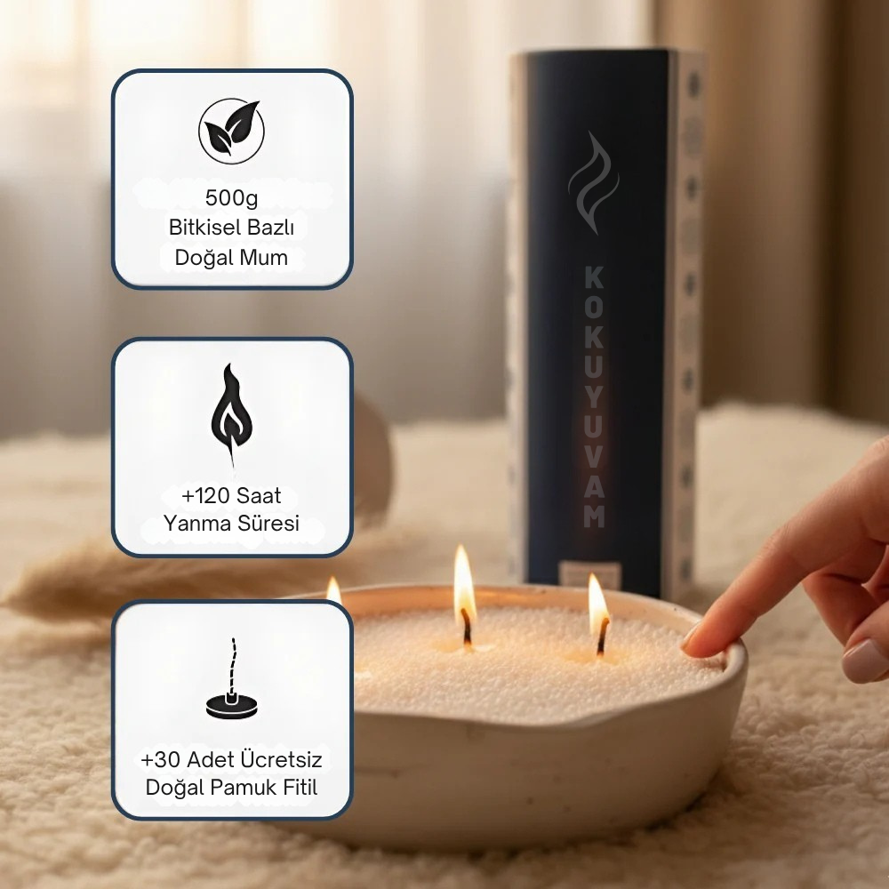 Kokuyuvam İnci Mumlar bitkisel bazlı, vegan yapıda olup minimum is ve dumanla temiz bir yanış sağlar.
