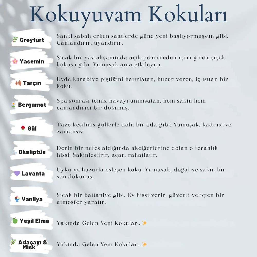 Kokuyuvam’ın ilk serisi kokusuz olarak üretilmiştir, ancak farklı kokulara sahip yeni versiyonlarımız üzerinde aktif olarak çalışıyoruz. 🌸